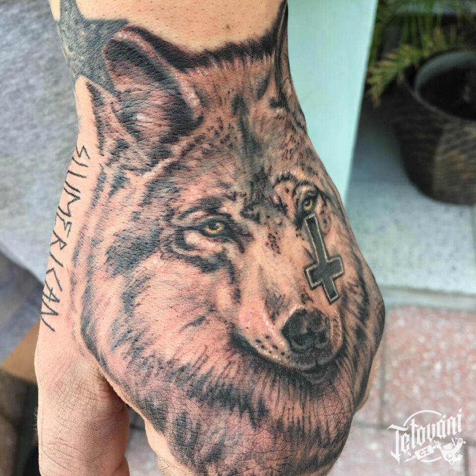 Tetování zvíře, hlava vlka na hřbetu ruky