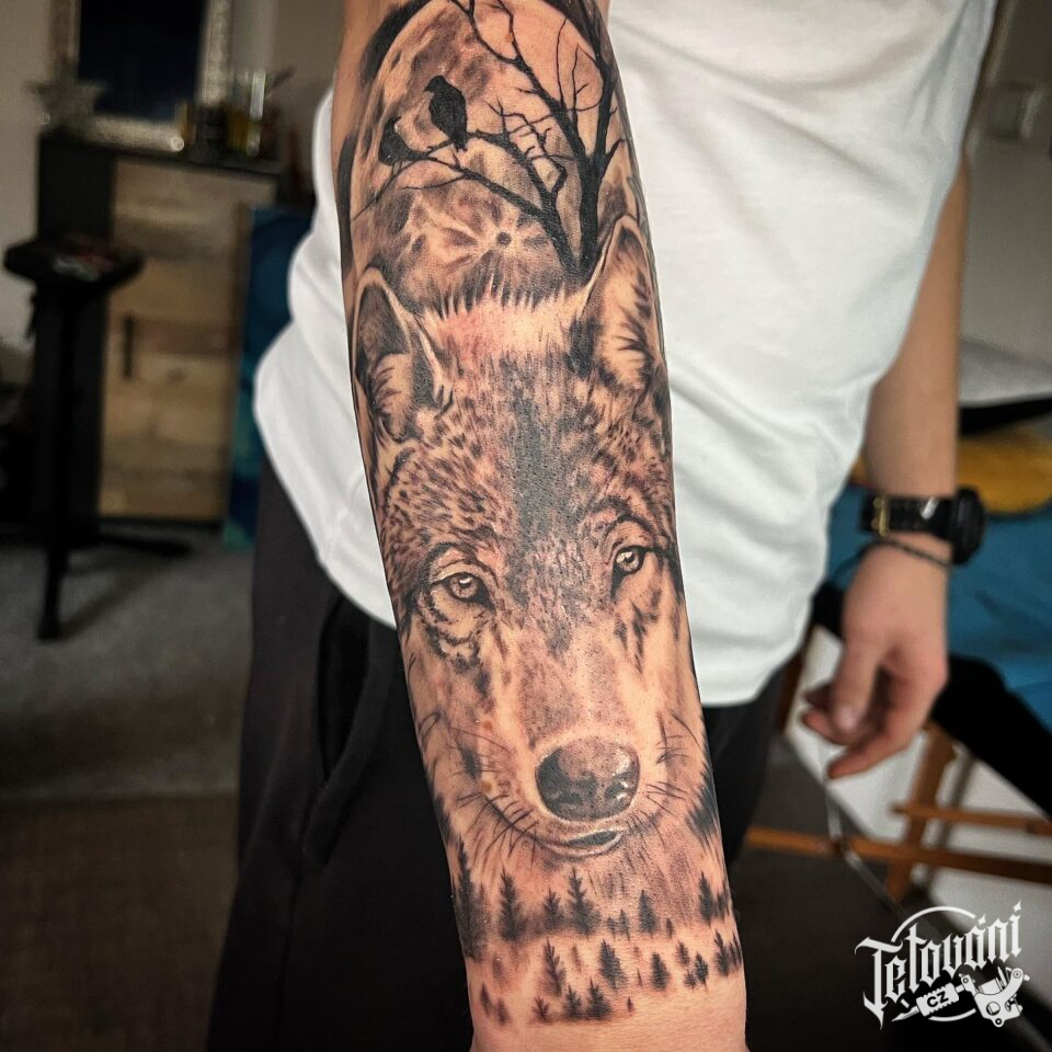 Tetování zvíře, hlava vlka na předloktí