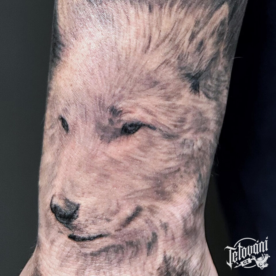 Tetování zvíře, hlava vlka na zápěstí