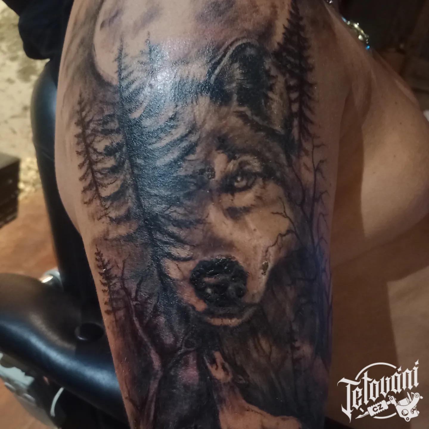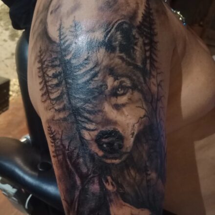 Tetování zvíře, hlava vlka s lebkou na zádech