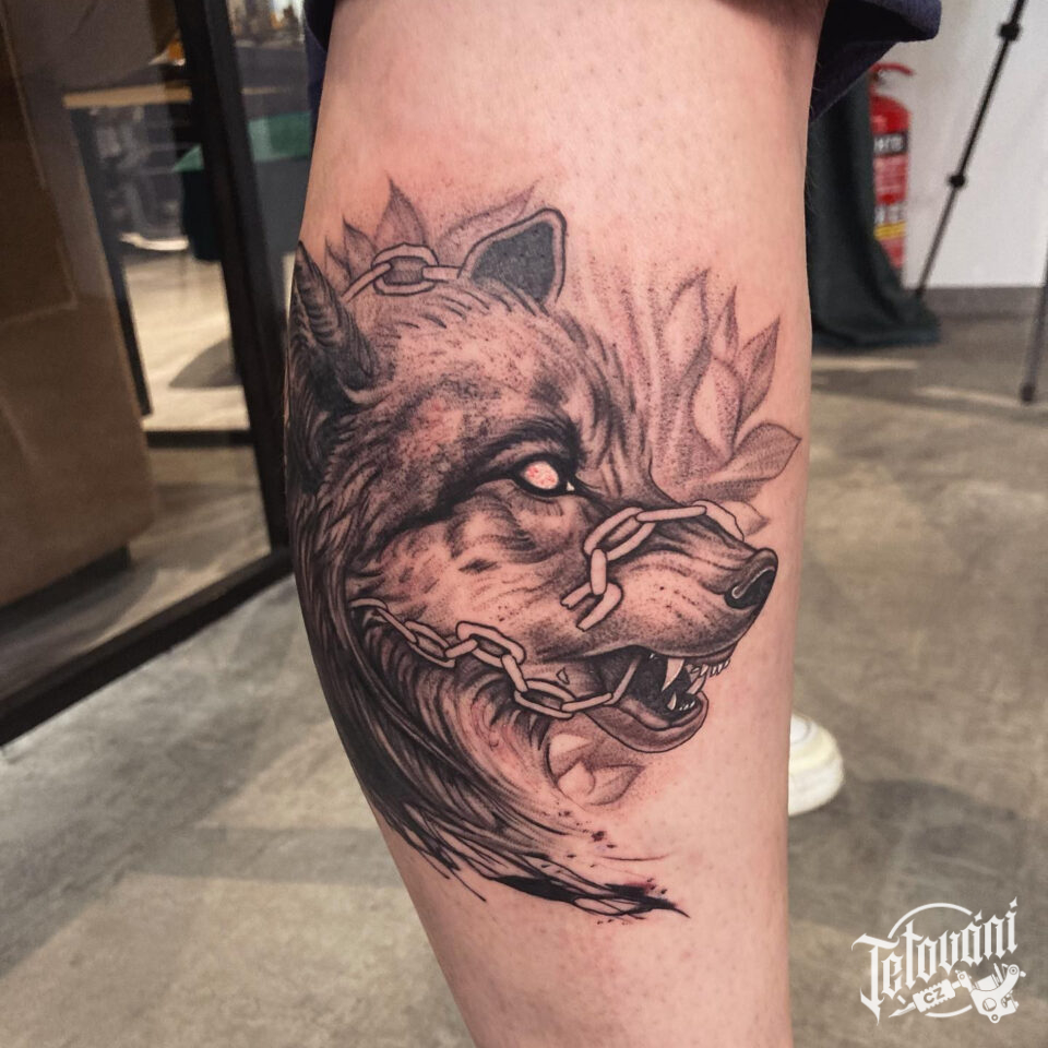 Tetování zvíře, hlava vlka s řetězem na lýtku