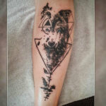 Tetování zvíře, hlava vlka, stromy, tvary, trojúhelníky na předloktí