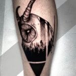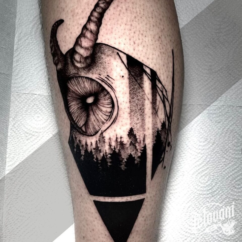 Tetování zvíře hlemýžď a příroda hory les na lýtko