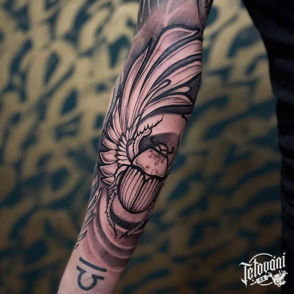 Tetování zvíře, hmyz, brouk, symbol života, květiny na předloktí