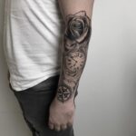 Tetování zvíře, holubice, zvíře, kompas, květina růže na předloktí