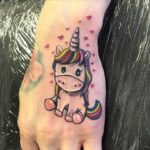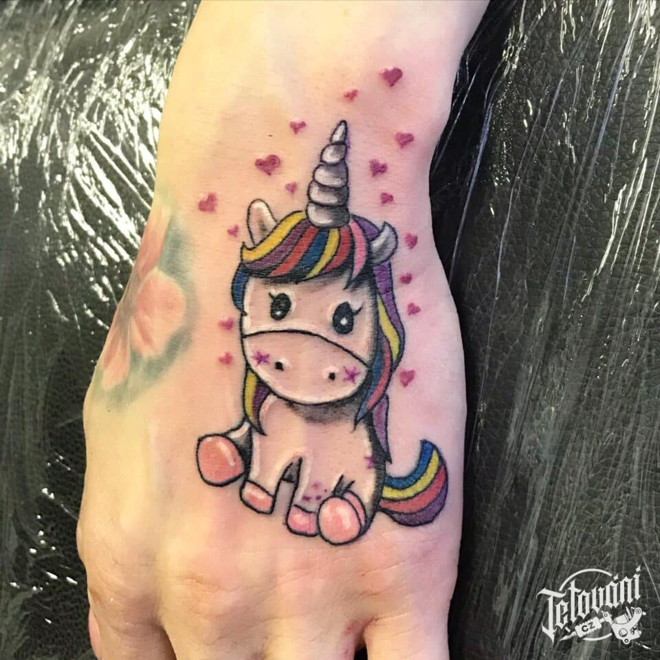 Tetování zvíře, jednorožec na hřbetu ruky