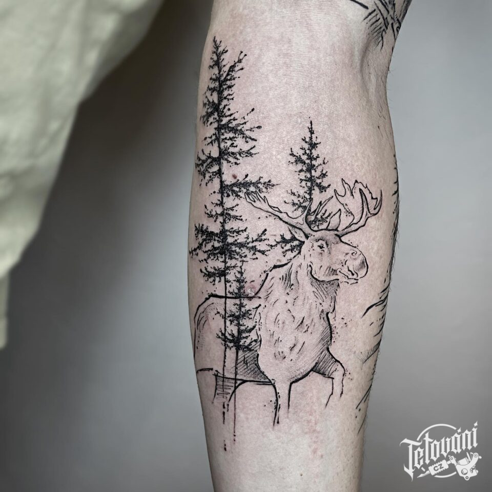 Tetování zvíře jelen, příroda les na předloktí