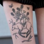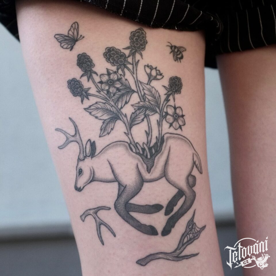 Tetování zvíře, jelen s květinami na stehně