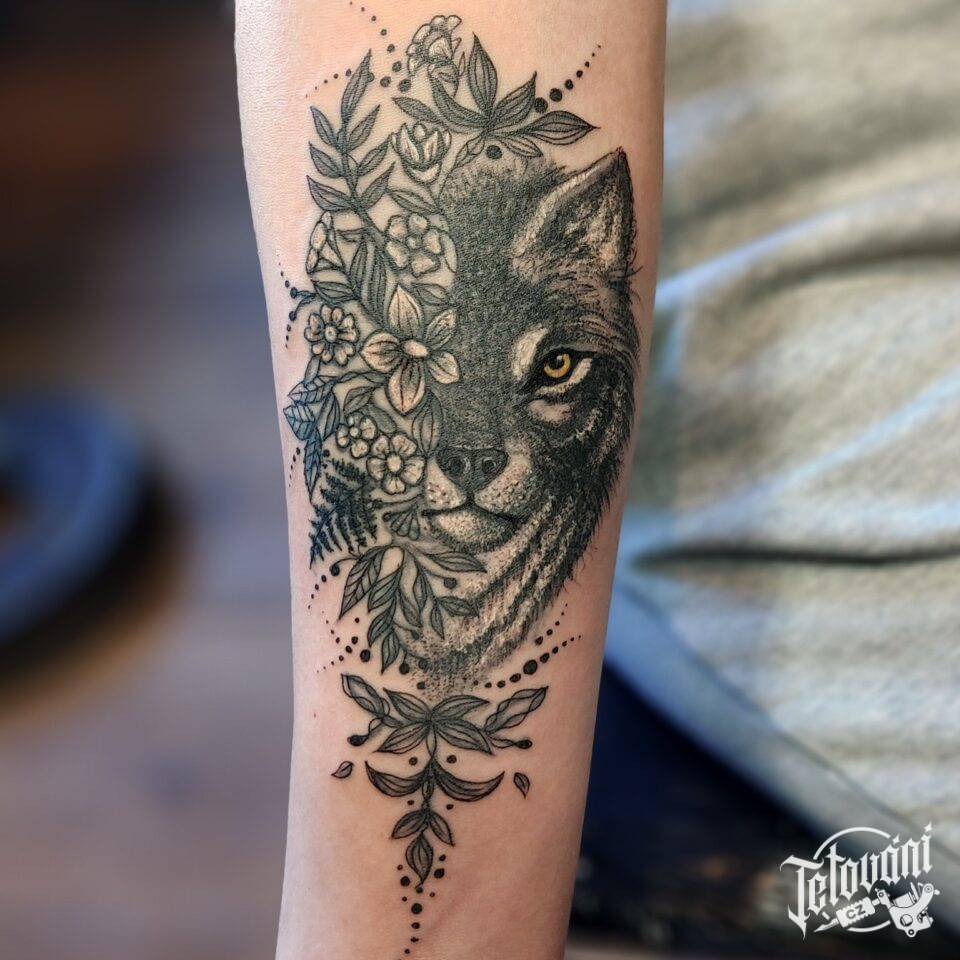 Tetování zvíře kočka a květiny na předloktí