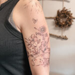 Tetování zvíře, kočka a luční kvítí na rameni