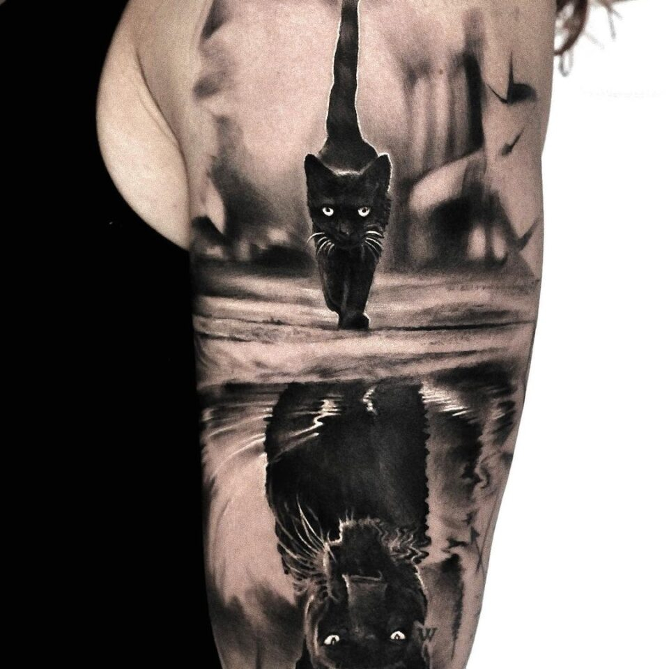 Tetování zvíře kočka a puma, symbol života na rameno
