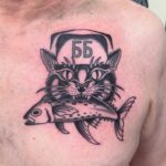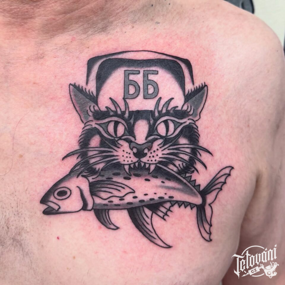 Tetování zvíře kočka a ryba na hrudník