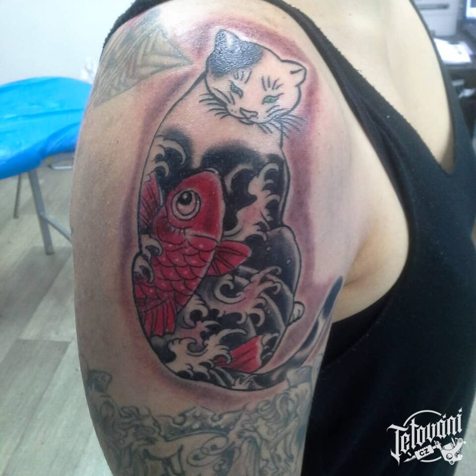 Tetování zvíře kočka a ryba na rameno