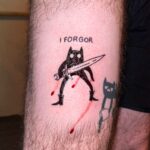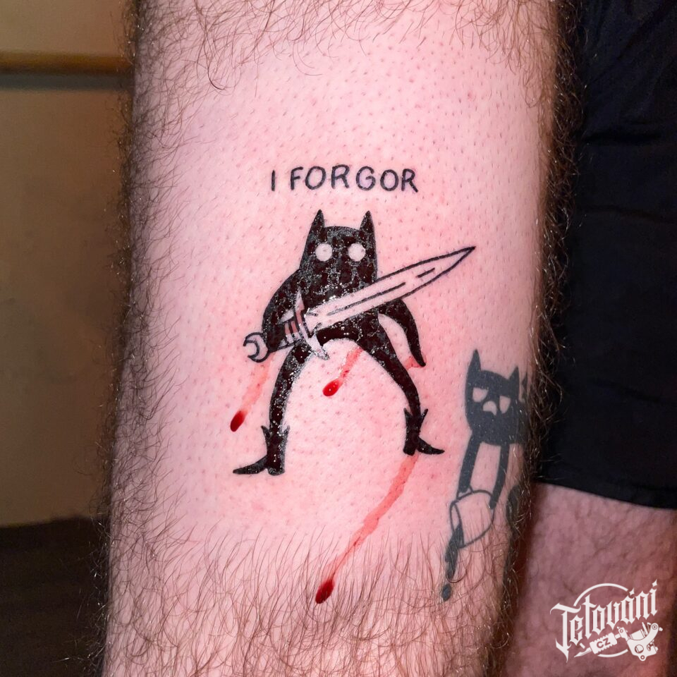 Tetování zvíře, kočka bojovník s mečem na stehně