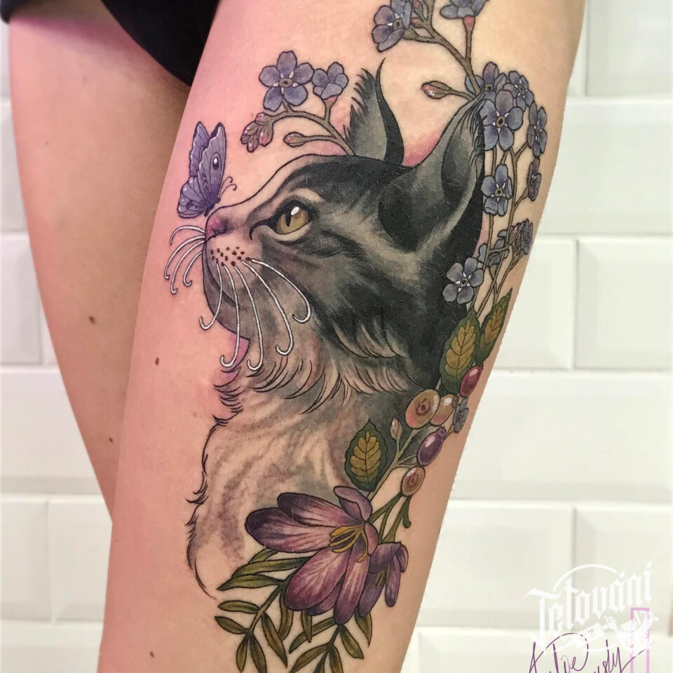 Tetování zvíře kočka, květiny na stehno