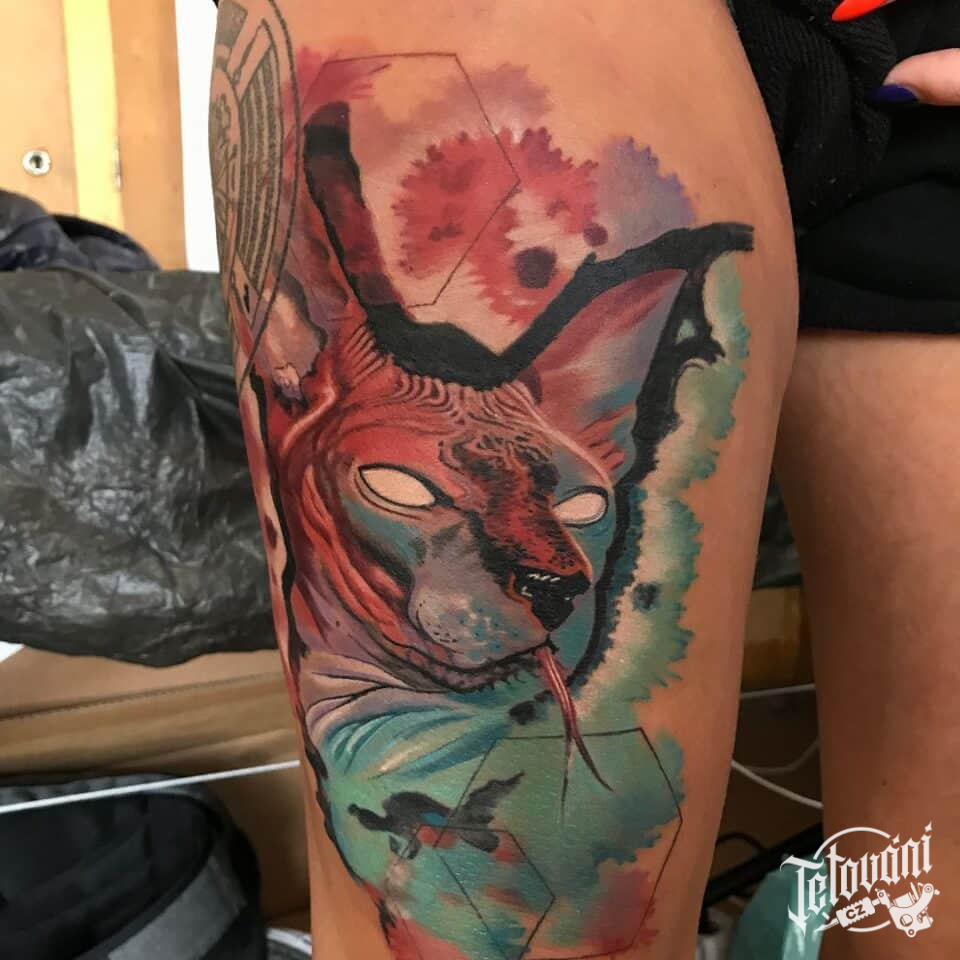 Tetování zvíře kočka na bok stehna