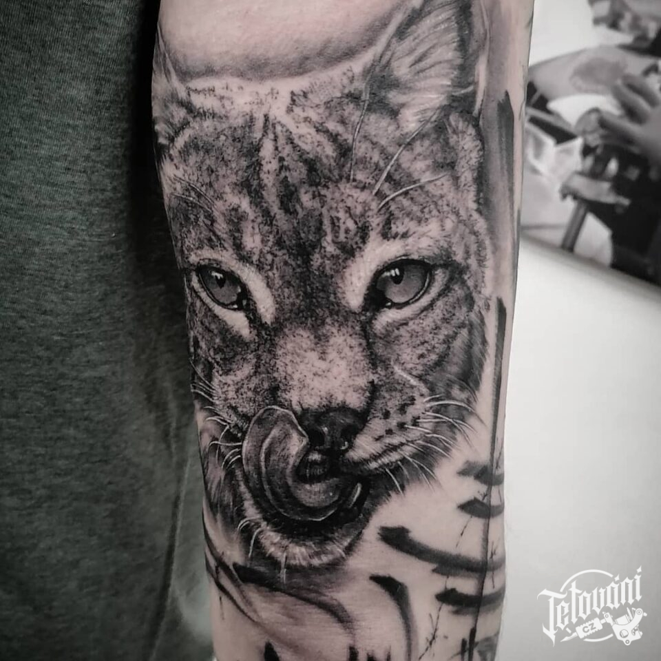 Tetování zvíře, kočka na loket