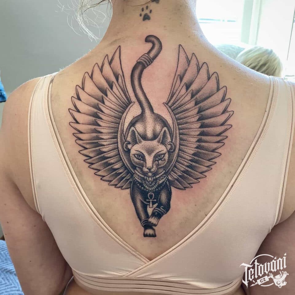 Tetování zvíře kočka s křídly na záda