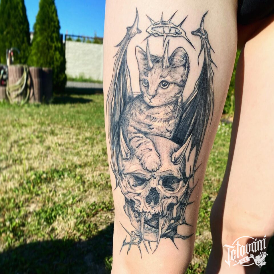 Tetování zvíře, kočka s lebkou na stehně