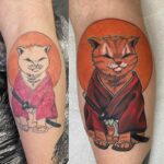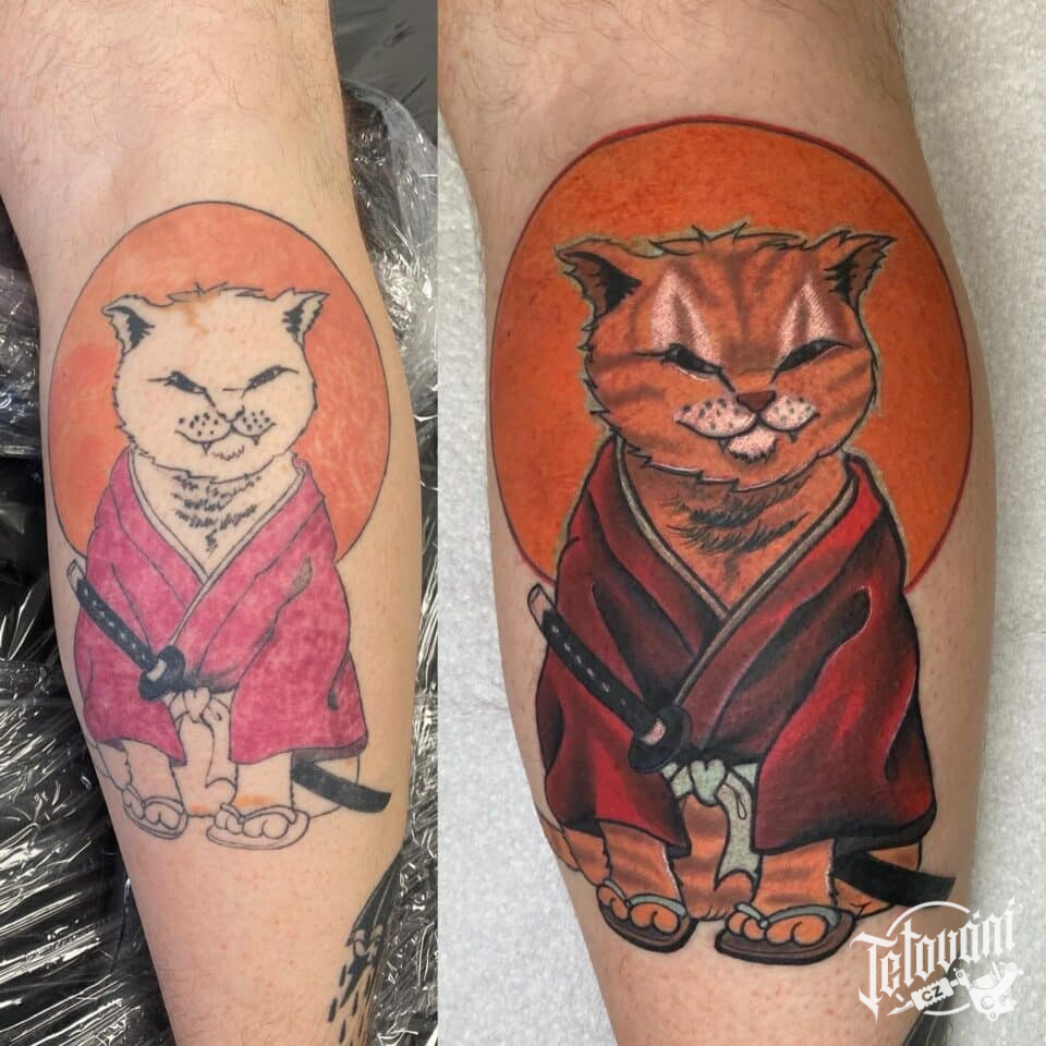 Tetování zvíře, kočka samuraj na lýtku