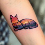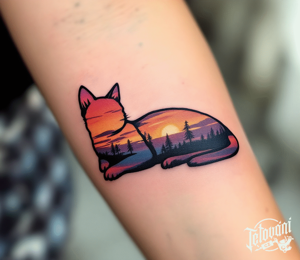 Tetování zvíře, kočka silueta se západem Slunce na předloktí