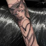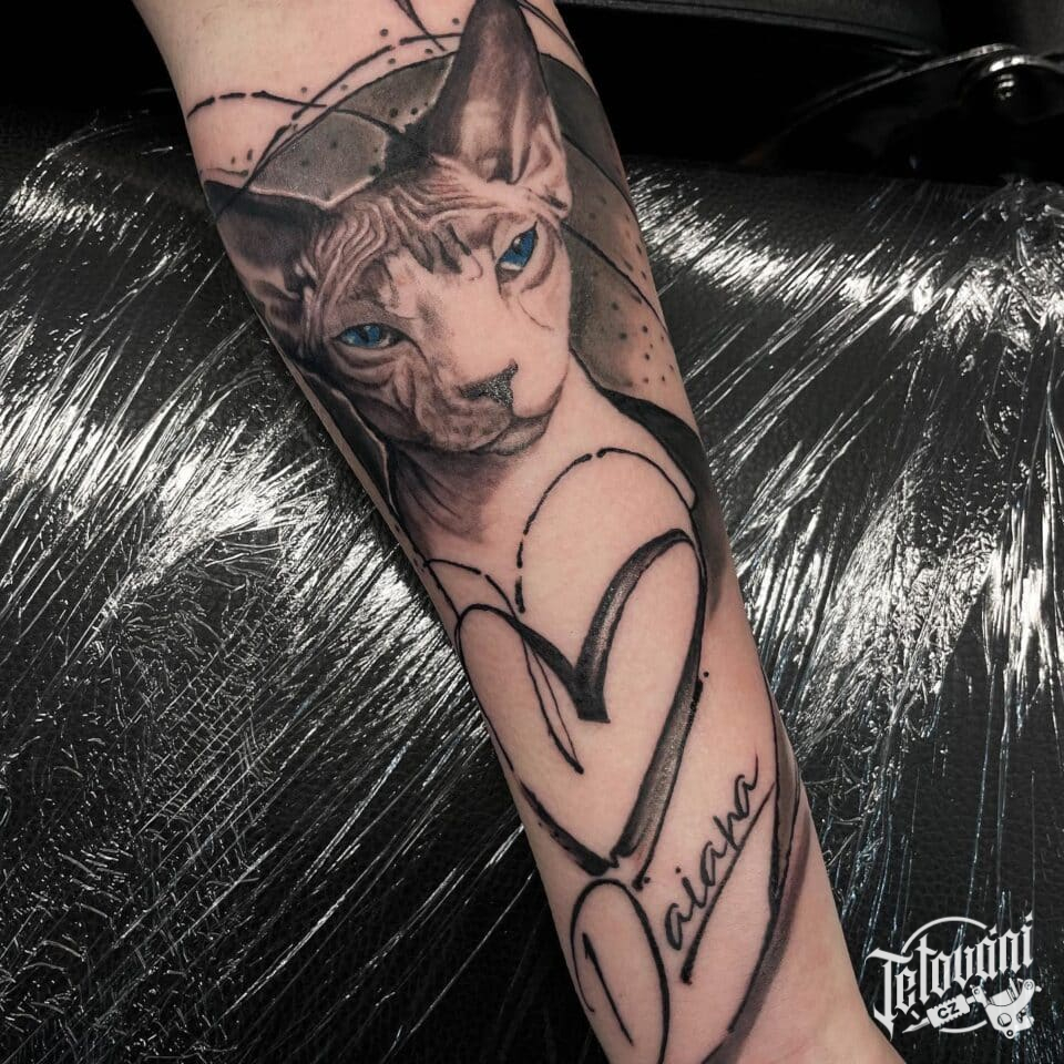 Tetování zvíře kočka, srdce, jméno na předloktí