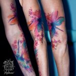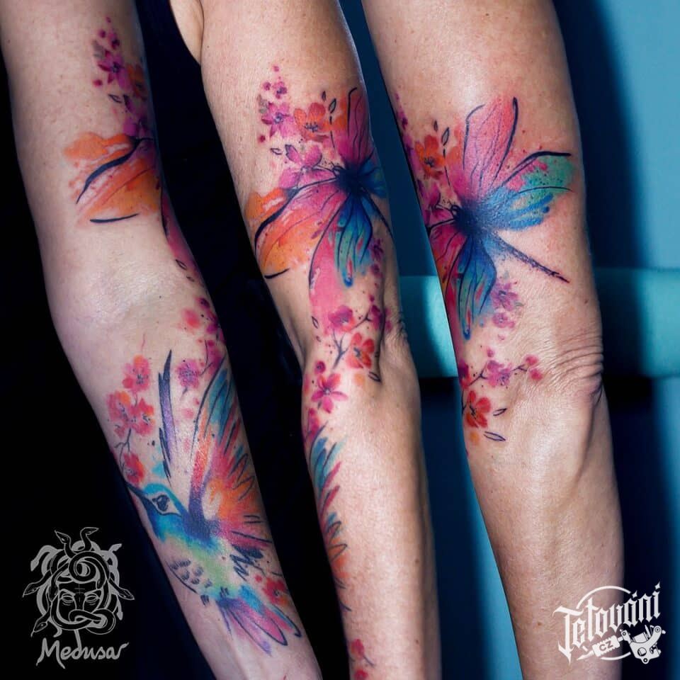 Tetování zvíře kolibřík a vážka, květiny na ruku