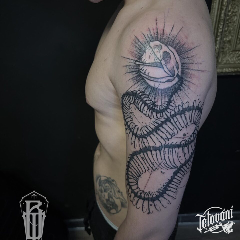 Tetování zvíře, kostra hada na rameni