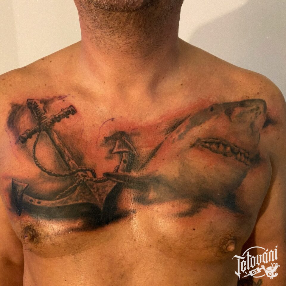 Tetování zvíře, kotva a žralok na hrudníku