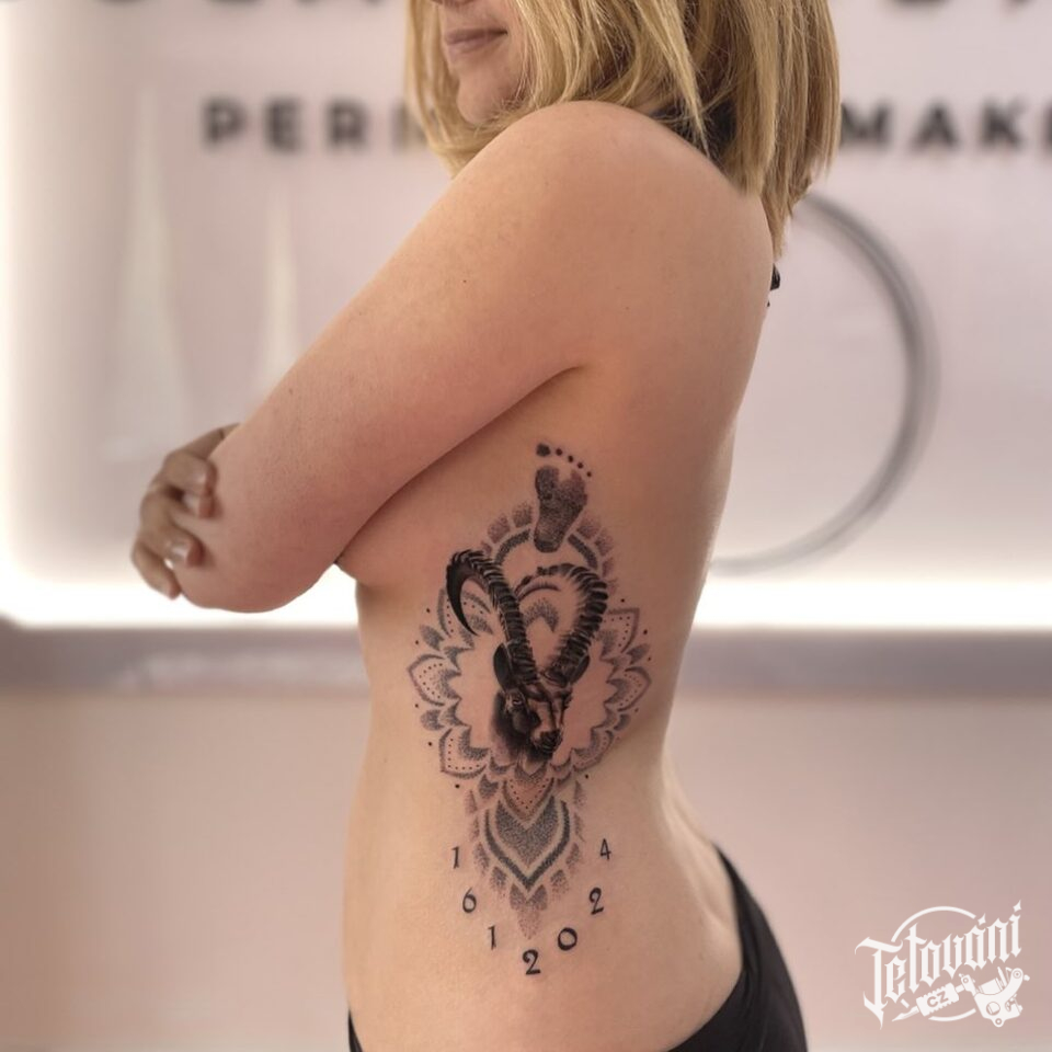 Tetování zvíře, kozoroh znamení zvěrokruhu a mandala na boku