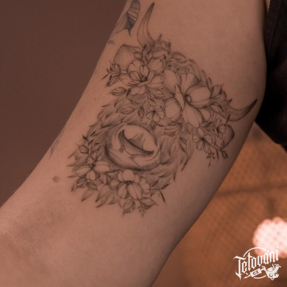 Tetování zvíře kráva z květin na paži