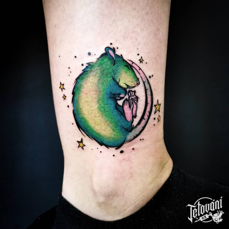 Tetování zvíře krysa, symbol, hvězdičky na lýtko