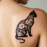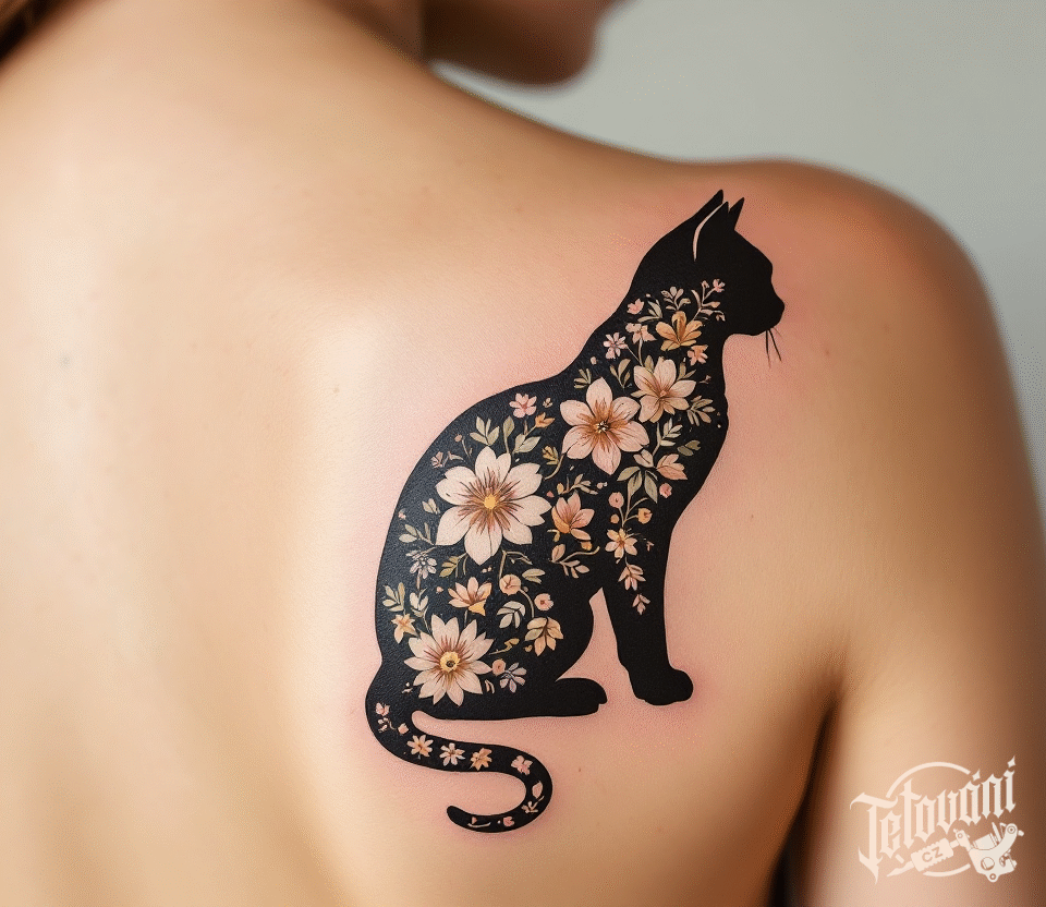Tetování zvíře, květinová kočka silueta na lopatce