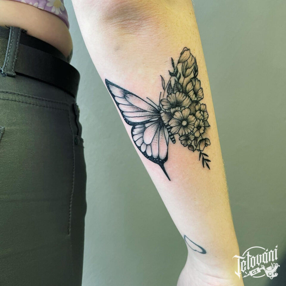 Tetování zvíře, květinový motýl na předloktí