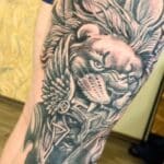 Tetování zvíře lev a bojovník na bok stehna