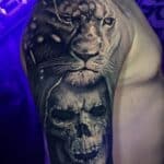 Tetování zvíře, lev a lebka na rameni