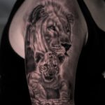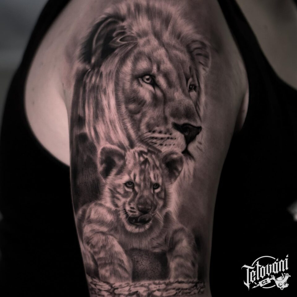 Tetování zvíře lev a lvíče, symbol rodiny na rameno