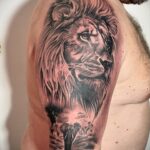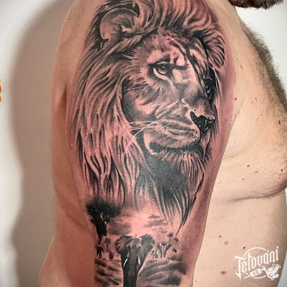 Tetování zvíře lev a slon na rameno