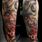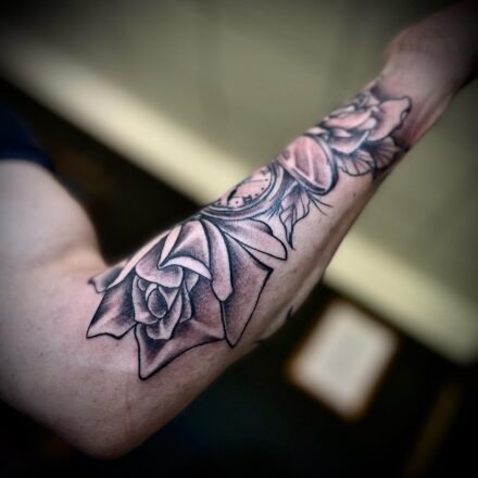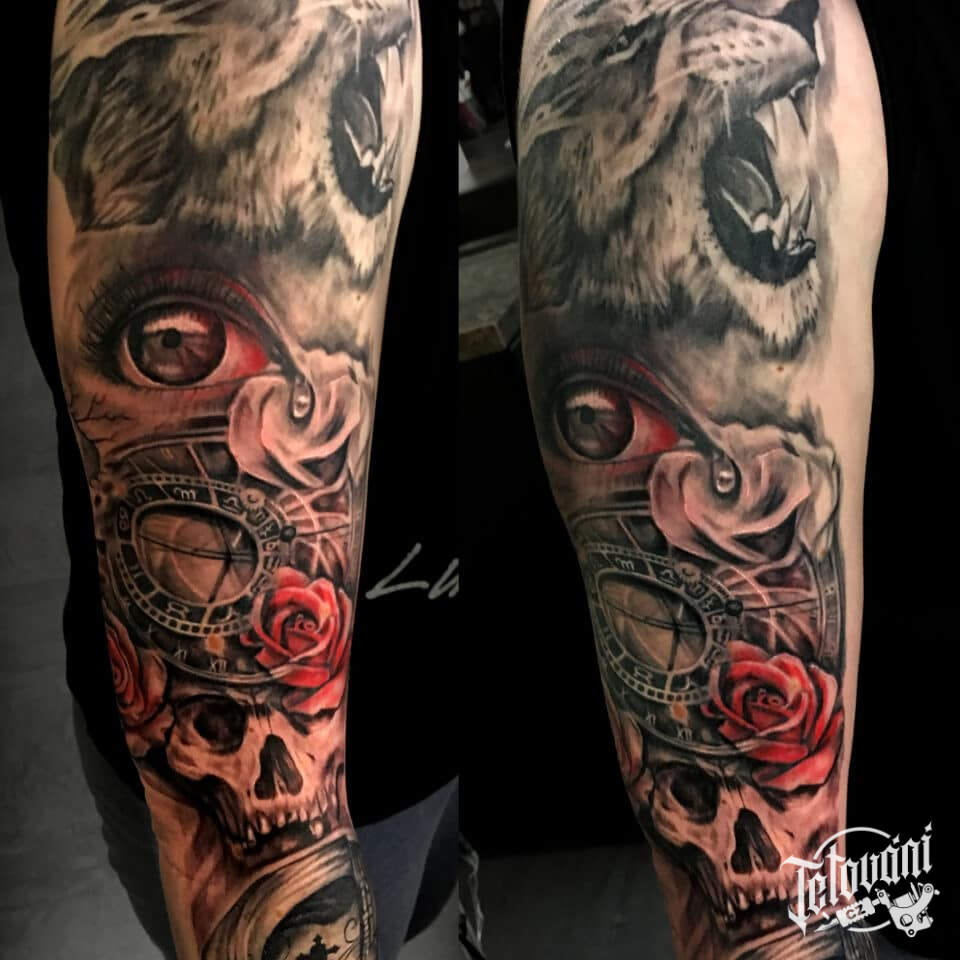 Tetování zvíře, lev, hodiny a růže, lebka a růže na paži