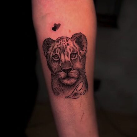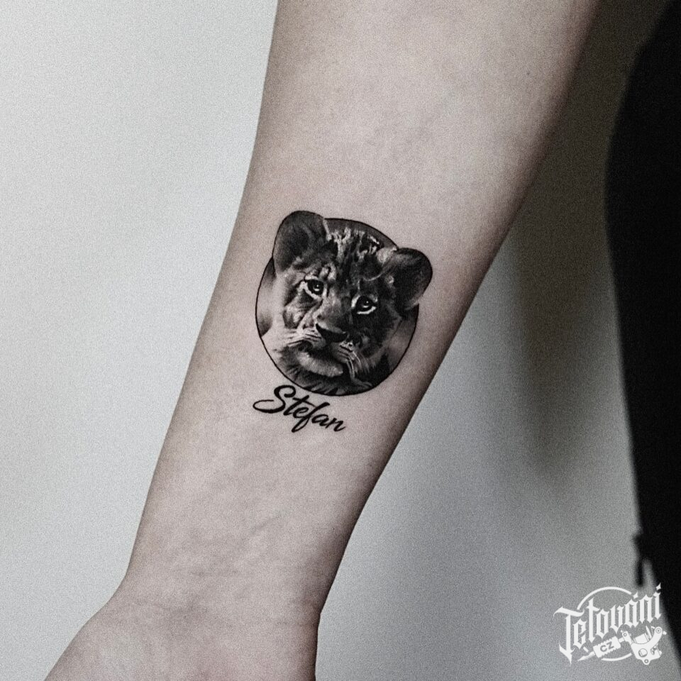 Tetování zvíře lev, jména děti, na předloktí