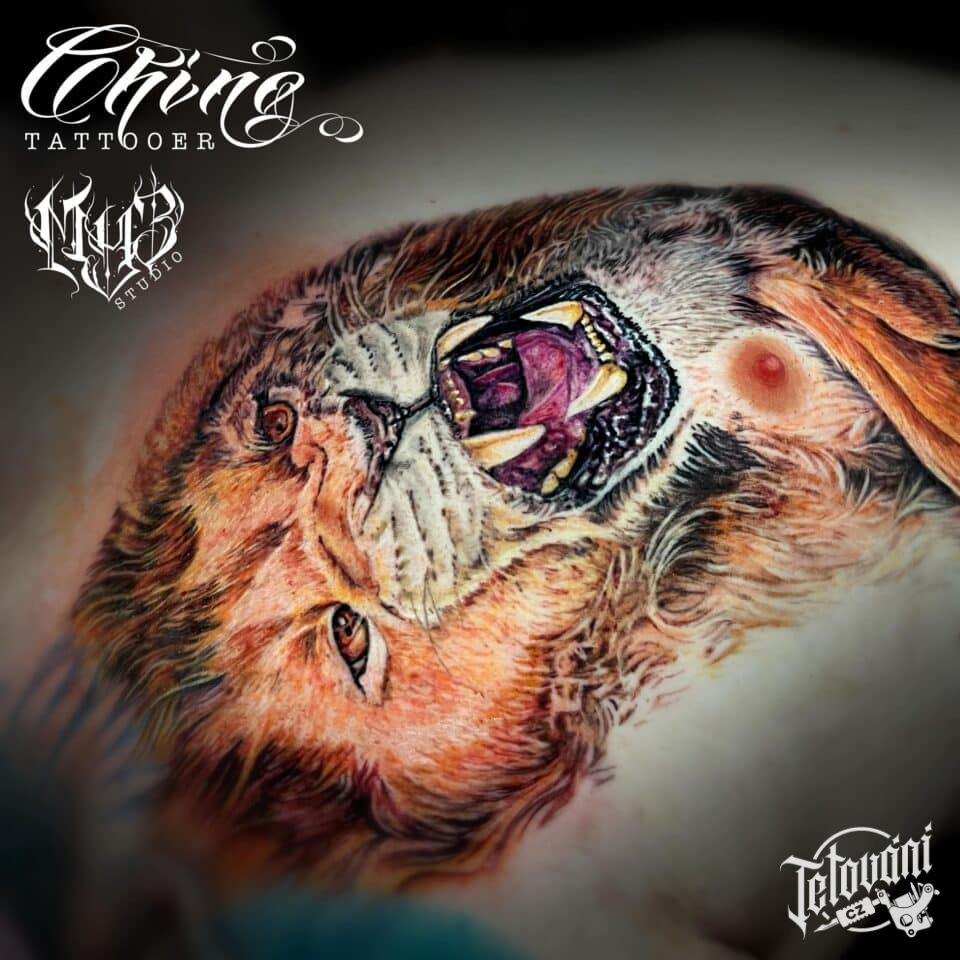 Tetování zvíře, lev na hrudi