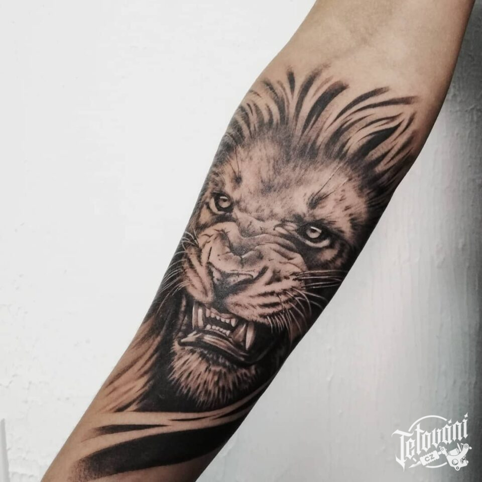 Tetování zvíře, lev na předloktí