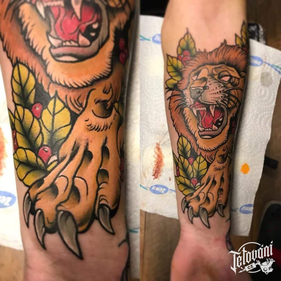 Tetování zvíře, lev na předloktí