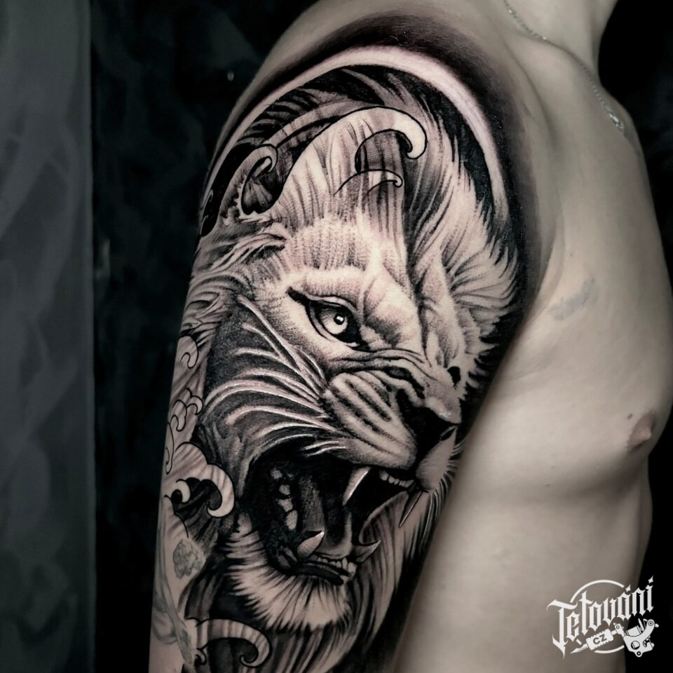 Tetování zvíře, lev na rameni