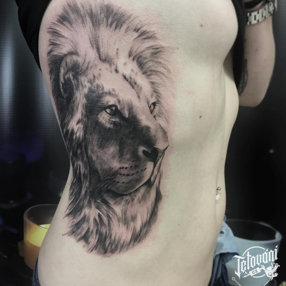 Tetování zvíře, lev na žebrech