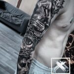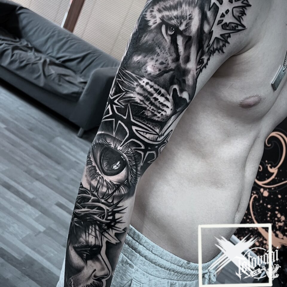 Tetování zvíře, lev, oko, portrét Ježíše, rukáv