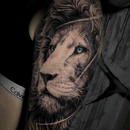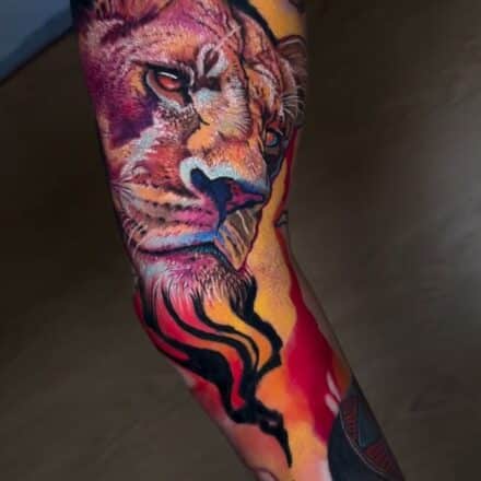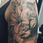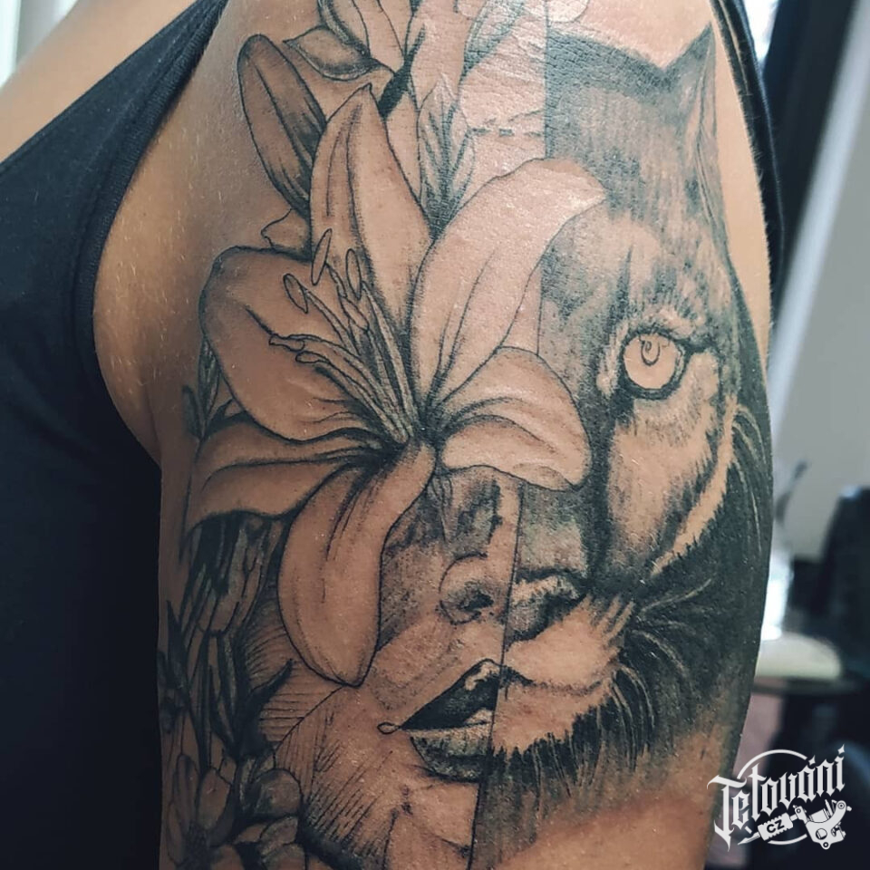 Tetování zvíře lev, portrét ženy a květina lilie na rameno
