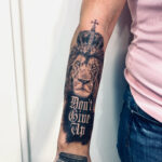 Tetování zvíře, lev s korunou a nápisy na předloktí