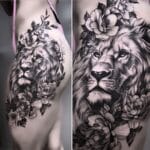 Tetování zvíře lev s květinami na boku