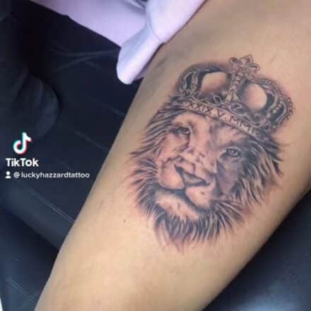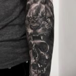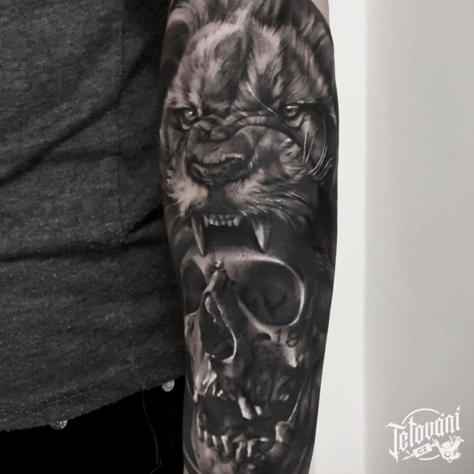 Tetování zvíře, lev s lebkou na předloktí